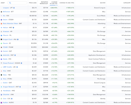 One of these non-Bitcoin opportunities is Web 3.0. Collectively, tokens of Web 3.0 projects gained 34% last week. Web 3.0 broadly describes the next evolution of the internet - one which incorporates new technologies to promote greater connectivity, data sharing and openness. The growing distrust of institutions over the last decade, particularly towards financial corporations and governments, is fostering a move towards systems and organizations that reduce middlemen and rely less on centralized intermediaries. The impact of this change is twofold: first, eliminating middlemen reduces costs and processing times across a number of industries. Second, the act of decentralizing control away from single entities redistributes wealth and power into the hands of many.