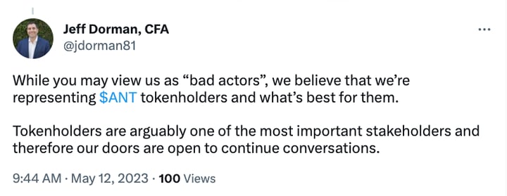 - Direct quote: "The letter was signed by Arca research analyst Alex Woodard, and came after a period of tension between Aragon and a group of activist investors who demanded changes to Aragon’s leadership." There were no requests for changes to Aragon's leadership—just to continue their buybacks and be open to discussing solutions with token holders.