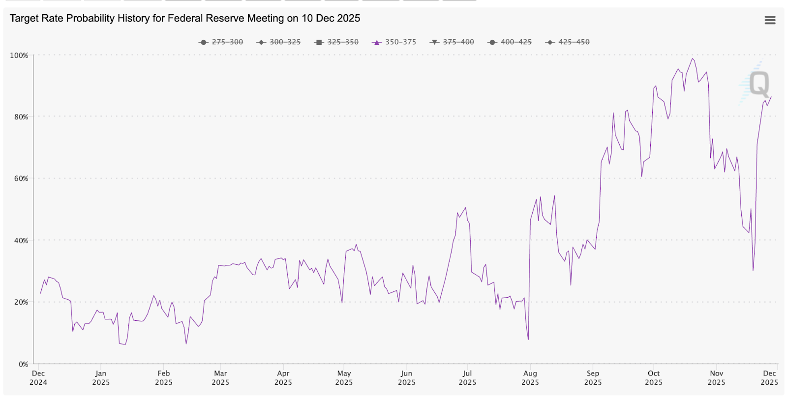 But a funny thing happened in the last week of November. Core PPI inflation fell to 2.6%, below expectations of 2.7%, and the little data we have on the labor market post-government shutdown indicate it is slowing, if not collapsing.  Rate-cut expectations for December quickly climbed back to almost 90%, and equities staged a fierce rally to close November in positive territory.  Further, President Trump has hinted at knowing who the next Fed Chairman will be, and prediction markets are basically fully pricing in Kevin Hassett, who is known for pushing faster rate cuts in alignment with the Trump admin, and is largely a macro bull.