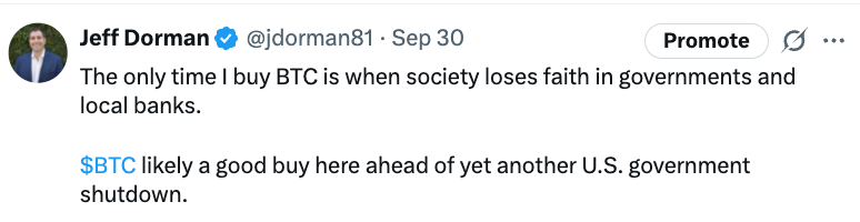 Was I right? Not entirely. Bitcoin did not rise in a vacuum. Gold also continued its march towards new all-time highs, as did equities. And many other large-cap crypto assets ascended as much or more than Bitcoin last week. So it wasn’t just a Bitcoin rally. But it’s all related to the government shutdown and other government fiascos. President Trump kicked off Wall Street’s new “debasement” trade last week after stating that the only way out of our debt spiral is to grow our way out of it, and Wall Street took that (rightfully so) as a cue that you have to own inflation-protection assets, else be left holding increasingly worthless fiat.